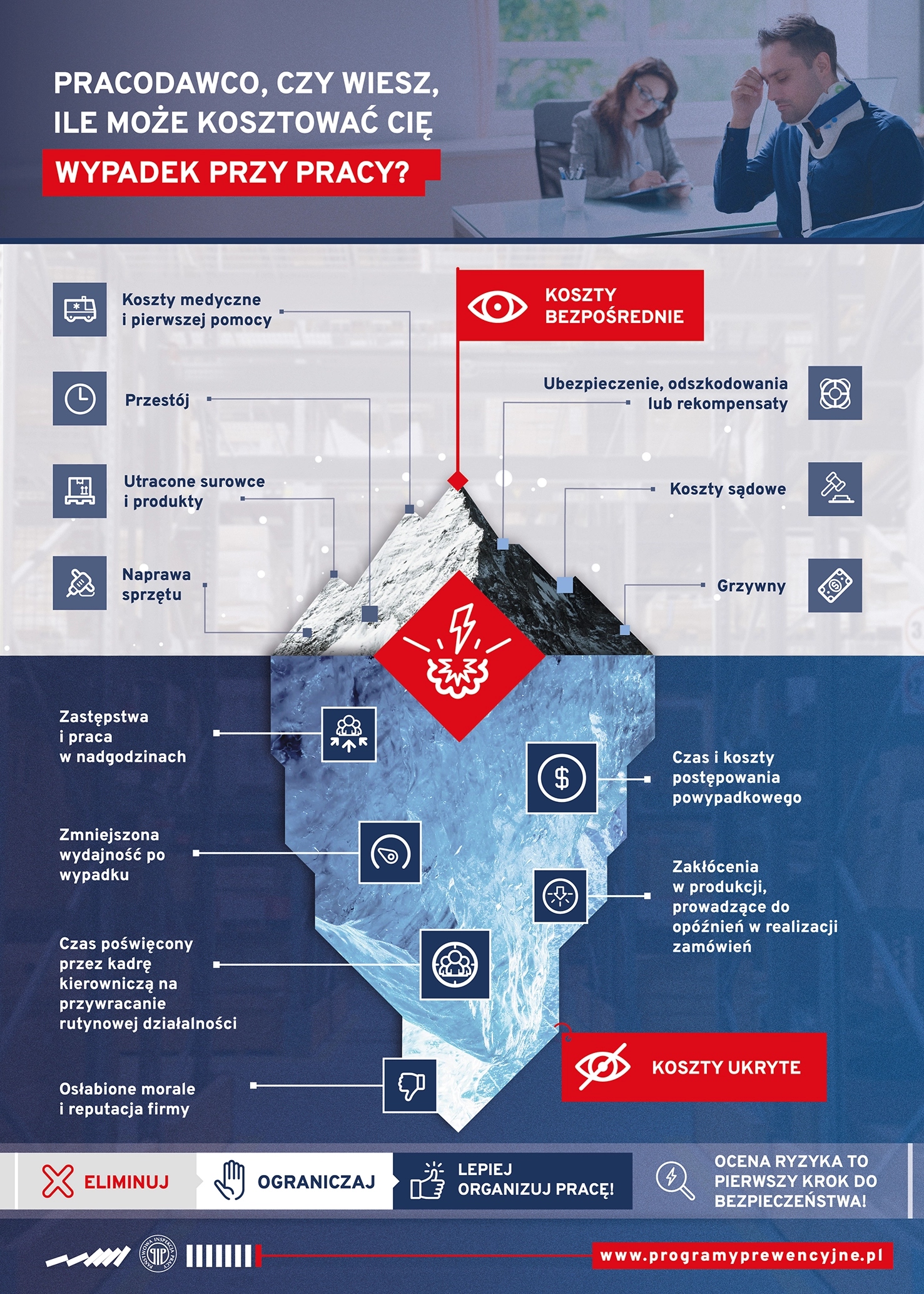 Wypadek przy pracy to także wymierne straty ekonomiczne. Wstrzymanie produkcji, konieczność zastąpienia poszkodowanego pracownika, naprawa lub wymiana uszkodzonych maszyn lub narzędzi, czasami odbudowanie całego zniszczonego stanowiska pracy,