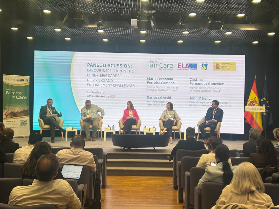 Inspektor Dariusz Górski został zaproszony do udziału w wydarzeniu w charakterze eksperta w panelu dyskusyjnym, w którym wraz z przedstawicielami z Portugalii, Hiszpanii i Irlandii rozmawiano na temat wyzwań, przed jaki stoją służby kontrolne dla skutecznego egzekwowana praw osób świadczących pracę w domach prywatnych, w charakterze opiekunów osób starszych lub chorych. Polska inspekcja pracy posiada doświadczenie w prowadzeniu czynności kontrolnych w odniesieniu do pracowników kierowanych do pracy za granicą, w celu wykonywania usług opiekuńczych na rzecz podopiecznych, z którymi zamieszkują wspólnie, co rodzi różnego rodzaju zagrożenia także w sferze pracy, ale generuje nieprawidłowości w sferze ubezpieczeń społecznych i podatków. Inspektor Górski, odwołując się do swojego doświadczenia zawodowego, miał okazję zaprezentować interesujący punkt widzenia, który stanowił ważny głos w dyskusji na temat wyzwań, przed którymi stoją służby kontrolne gdy kontrola dotyczy praw osób pracujących w domach prywatnych, w tym także za pośrednictwem platform internetowych.