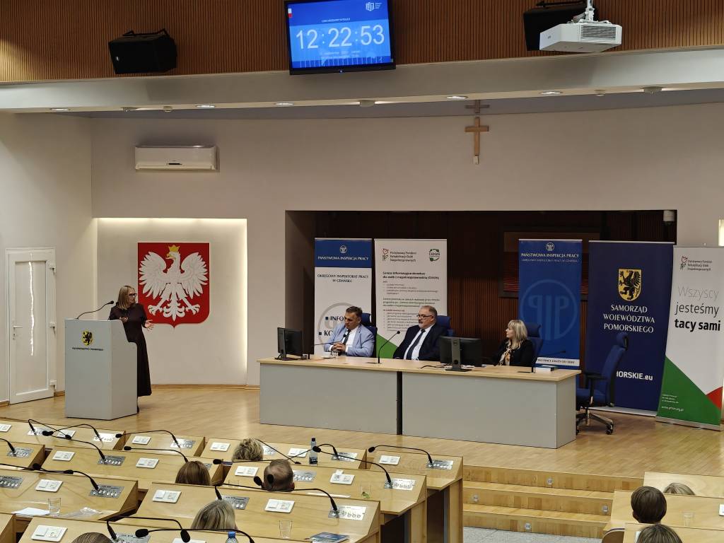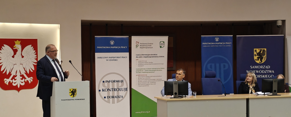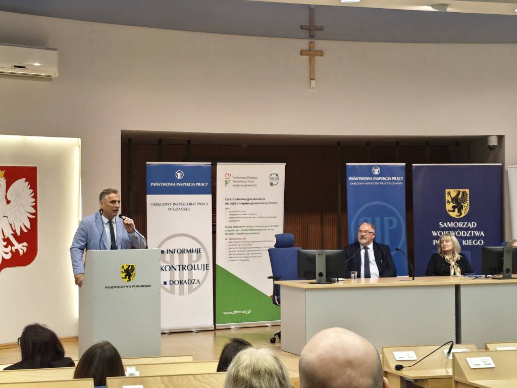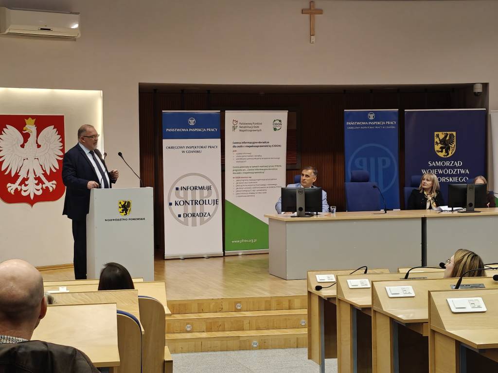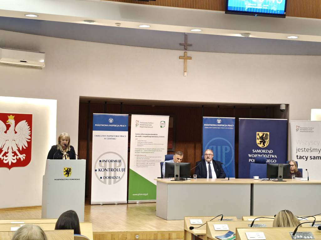 W sali im. Lecha Bądkowskiego w Urzędzie Marszałkowskim Województwa Pomorskiego w Gdańsku 21 października br. odbyła się konferencja pod tytułem „Zatrudnianie osób z niepełnosprawnościami”, którą Okręgowy Inspektorat Pracy w Gdańsku zorganizował we współpracy z Oddziałem Pomorskim Państwowego Funduszu Rehabilitacji Osób Niepełnosprawnych. W konferencji uczestniczyli przedstawiciele wielu środowisk – pracodawcy, samorządowcy, eksperci rynku pracy, organizacje pozarządowe oraz osoby z niepełnosprawnościami. Spotkanie miało na celu przybliżenie problematyki zatrudniania osób z niepełnosprawnościami, a jego głównym motywem przewodnim było pytanie: czy zatrudnienie osoby niepełnosprawnej stanowi wyzwanie, czy też szansę – zarówno dla pracodawcy, jak i dla samego pracownika.