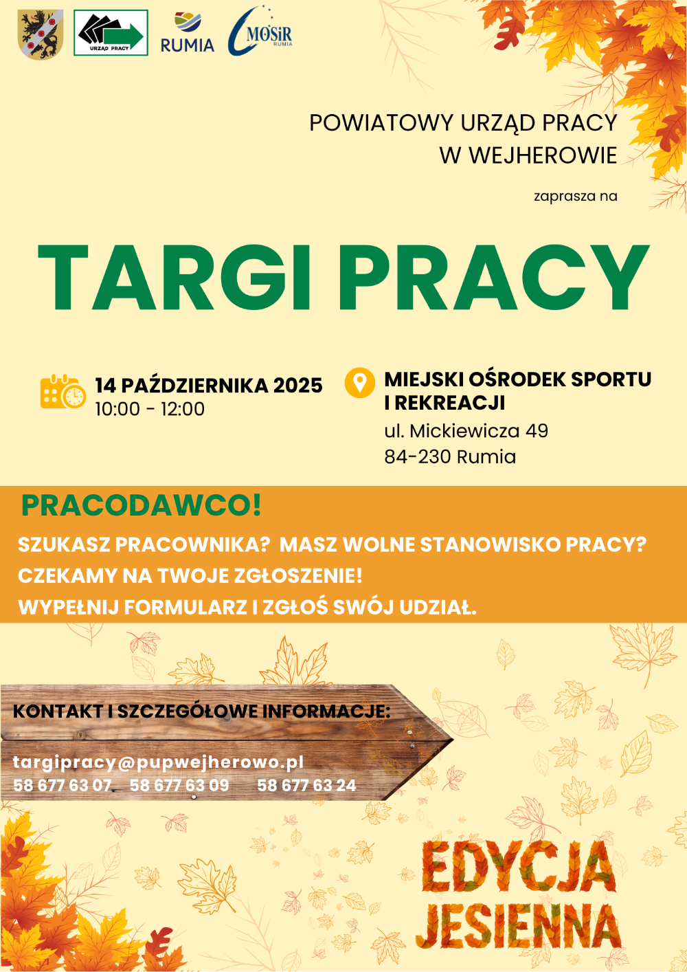 Więcej informacji na stornie organizatora: Przedsiębiorco! Przyjdź na Targi Pracy - edycja jesienna! - Powiatowy Urząd Pracy w Wejherowie - Administracja