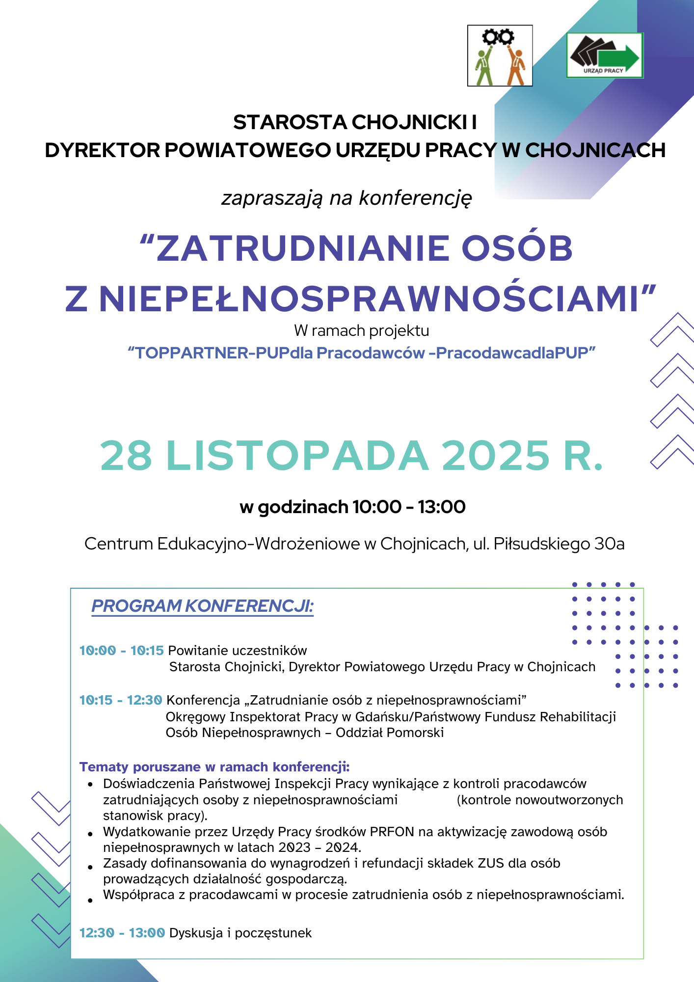Zapraszamy serdecznie na konferencję pt. "Zatrudnianie osób z niepełnosprawnościami" organizowaną przez Powiatowy Urząd Pracy w Chojnicach wraz z Starostą Chojnickim. Podczas wydarzenia nasz ekspert wygłosi prelekcję dotyczącą doświadczeń Państwowej Inspekcji Pracy wynikających z kontroli pracodawców zatrudniających osoby z niepełnosprawnościami.
